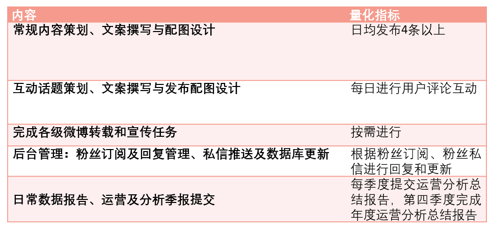 服務(wù)包含:常規(guī)內(nèi)容發(fā)布、 互動(dòng)話題發(fā)布、 粉絲訂閱及回復(fù)管理、 建立運(yùn)營(yíng)數(shù)據(jù)庫(kù)、 日常數(shù)據(jù)報(bào)告