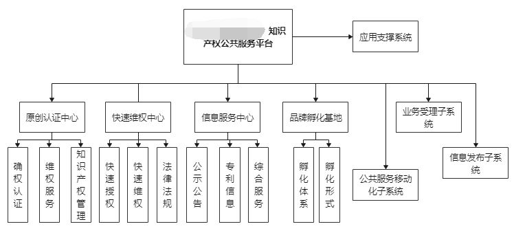 知識(shí)產(chǎn)權(quán)公共服務(wù)平臺(tái)建立4個(gè)中心,分別是原創(chuàng)認(rèn)證中心、快速維權(quán)中心、信息服務(wù)中心、品牌孵化基地,分別對(duì)知識(shí)產(chǎn)權(quán)認(rèn)證服務(wù)、知識(shí)產(chǎn)權(quán)維權(quán)、知識(shí)產(chǎn)權(quán)信息服務(wù)(含公示服務(wù)和綜合服務(wù))、品牌孵化服務(wù)四個(gè)知識(shí)產(chǎn)權(quán)公共服務(wù)方向提供信息和業(yè)務(wù)服務(wù)