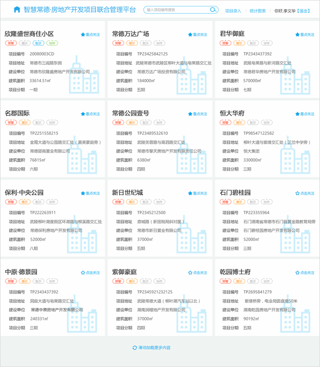 主頁將市所有房地產(chǎn)項目進行立項,根據(jù)項目編號以及項目名稱查找和管理項目。支持對項目進行快速關注,以及項目中基本信息、提示信息進行整體查看。